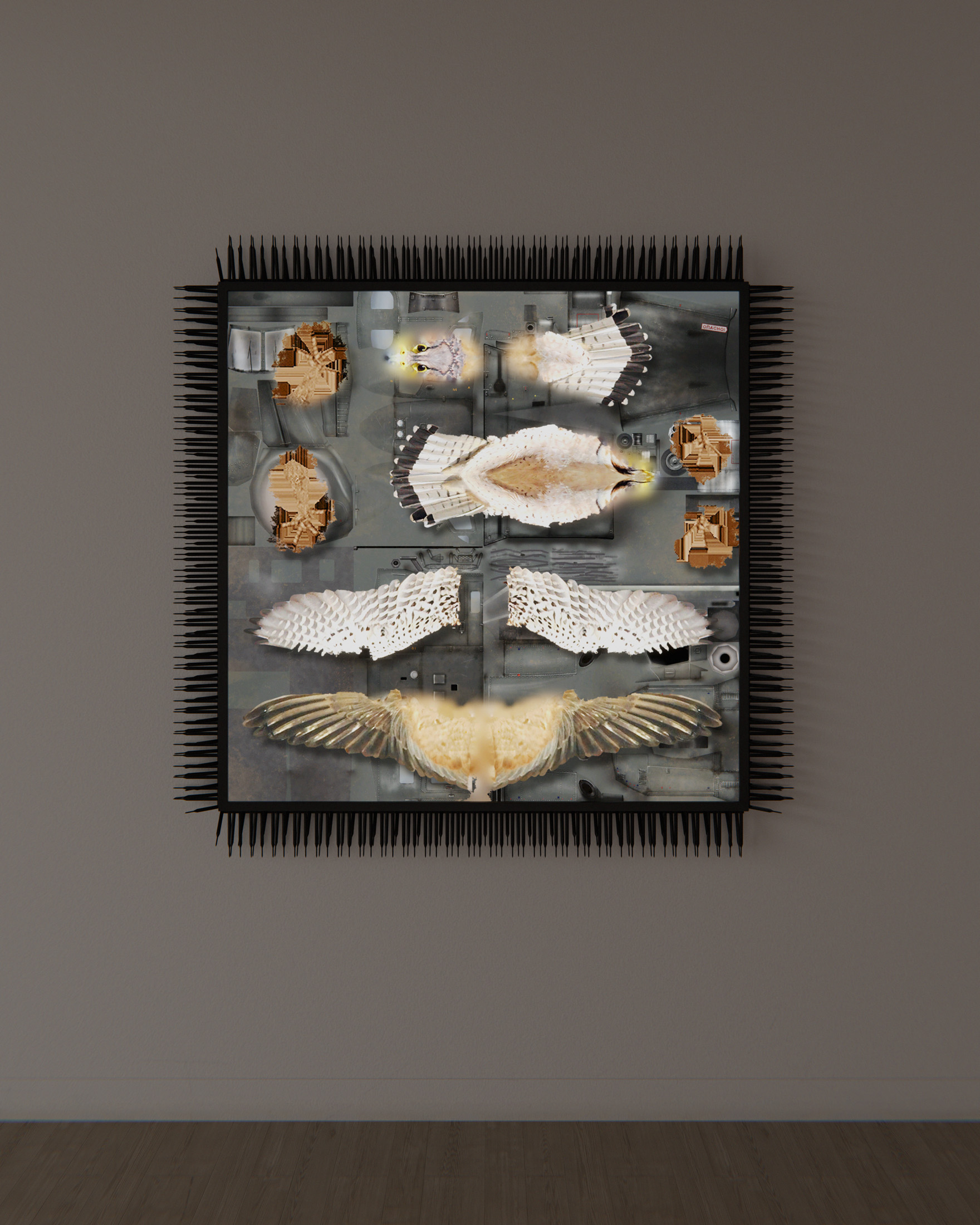 A series of lightboxes feature collages made by extracting UV textures from the game platform. These flat and puzzle-like images are mapped onto 3D models to give the illusion of solidity and immersion. Suspended as if airdropped into the space, three looping video monitors feature ambient scenes constructed within ArmA—making use of the slow cinema genre to question the conflation of naturalistic but ultimately escapist depictions of modern war.